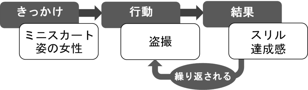 毎日のように繰り返される中で,行動アディクションに至る行動の連鎖は強固になり,車の運転や歯磨きなどのように,一連の行動アディクションに至る連鎖についてはっきりと意識することが困難になっていきます。「撮ろう」などととくに意識することはなくても,「撮りやすい」対象の方を見つけると,盗撮という行動が引き起こされてしまいます。