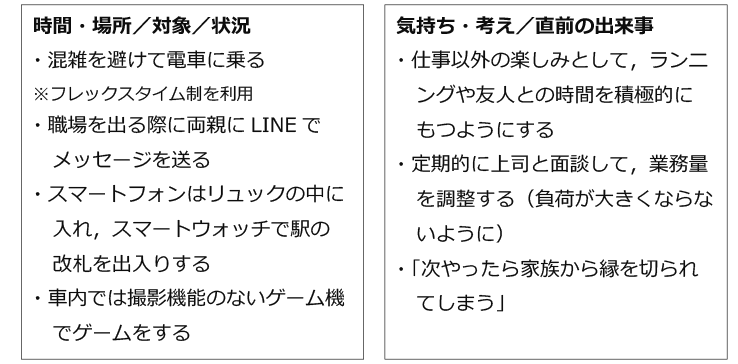 Bさんの場合は,職場の上司のサポートもあり,労働時間を調整できるフレックスタイム制を利用して,混雑する時間帯より遅めに帰宅できるような勤務時間に変更することにしました(図3:行動の「引き金」対策シートの例(Bさんの場合))。また,職場を出るときに親にメッセージを送り,スマートフォンをリュックサックの中にしまってからスマートウォッチで駅の改札を出入りできるようにしました。対象となる女性をできるだけ視界に入れないようにするため,電車に乗っている間は撮影機能のないゲーム機でゲームをすることにしました。