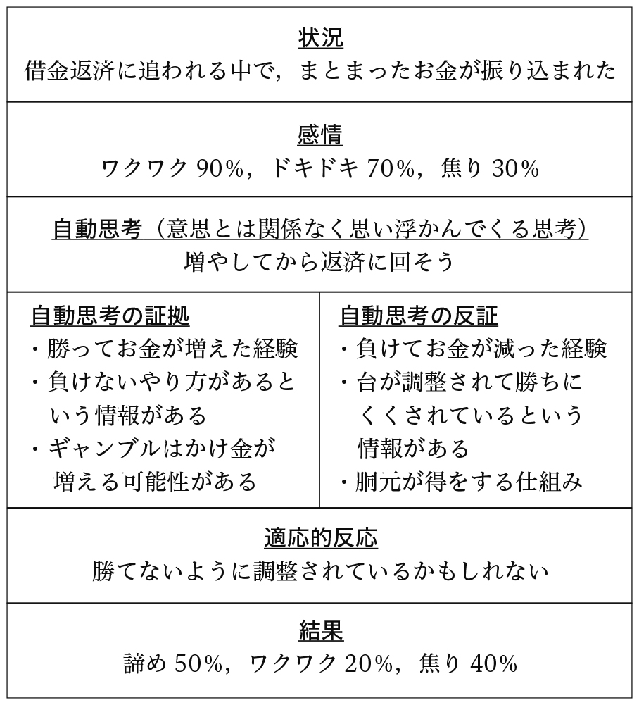 Eさんは,セラピストと,同じくギャンブルの問題を抱える仲間と思考の置き換えを試みました(図2:コラム法(Eさんの場合))。借金や月々の生活費の支払いなどに追われる日々の中で,まとまったお金が振り込まれると,「増やして返そう」という考えがわき,勝つことへの期待を胸に,ワクワクしながらお金をおろしてパチスロに行っていたといいます。このような思考が適切であると考える理由としては,実際に勝ってお金が増えた経験があることや,負けないやり方があるという情報があることなどがあり,適切ではないと考える理由としては,負けた経験があることや,台が調整されて勝ちにくくされているという情報があることなどが挙げられました。