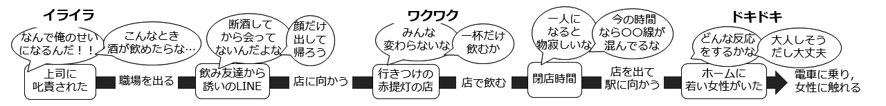 Dさんは,仕事終わりにお酒を飲み,帰りの電車で痴漢行為を繰り返していました。逮捕をきっかけに,自身の行動の引き金になっている飲酒をやめて,専門クリニックに通い始めました。ある日,上司の𠮟責にイライラしていたときに,飲み友達から久しぶりに連絡が来ました。「顔だけ出して帰ろう」と店に向かいましたが,みんなに勧められて,「一杯だけ」とお酒を口にすると,そのまま閉店時間まで飲み続けてしまいました。一人になり,物寂しさを感じながら自宅に向かう途中,混雑する駅のホームでロングスカートの大人しそうな女性の姿を前にして,「触りたい」という強い衝動に抗えませんでした(図1:痴漢行為に至る行動連鎖(Dさんの場合))。