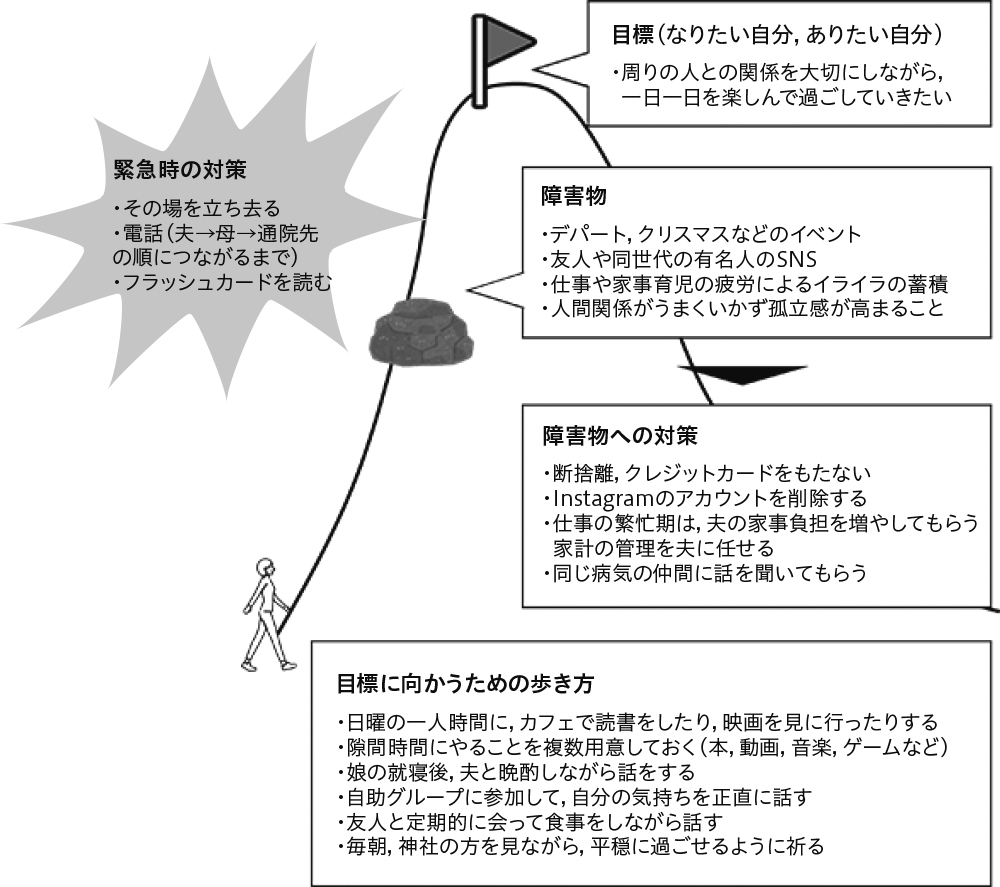 内的な引き金に対しては,イライラや孤立感などネガティブな気持ちをため込まないように,家計の管理は夫に任せることにして,仕事の繁忙期には,夫の家事負担を増やしてもらうことを事前に取り決めました。そして,毎晩夫と話をすること,毎週自助グループに参加して同じ問題を抱える仲間と話をすることを継続することにしました。