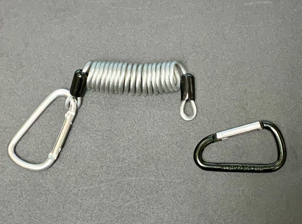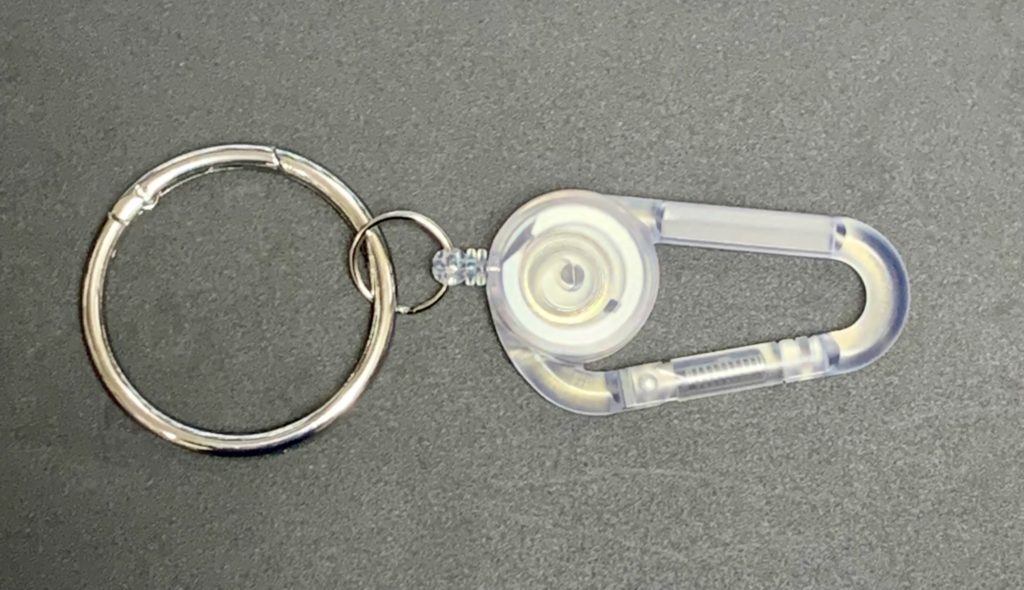Uさんは下を向いたまま,しかし,目線だけはその伸び縮みの動作に合わせてくれました。ちなみに,提示したスプリング式キーホルダーの左側には“持ち手”となるカラビナフックが最初から付属していますが,右側にはないので,別売りのカラビナフックを100円ショップで買い足して(写真1),装着しました。