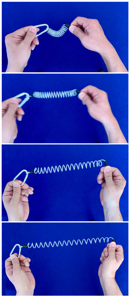 私は,ずっと下を向き続けているUさんに,「これ,見て。ビヨーン,ビヨーンって,引っ張ると伸びて,力を抜くと元に戻って縮むんだよ」と言って,スプリング式キーホルダー(ダイソー製・写真1)を伸び縮みさせて見せました(写真2)。