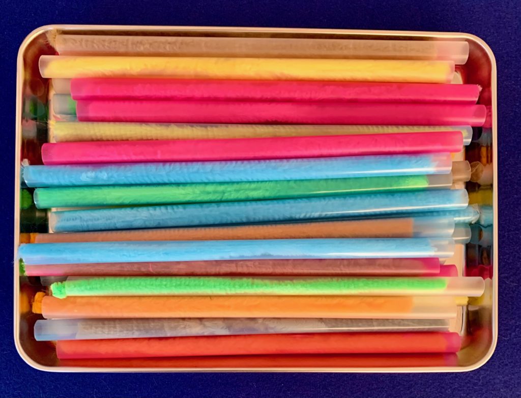 ②極太モールを大口径のストローに差し込んでいく課題は,まず,見た目,「この超珍しい!極太のモールがそれに見合った,この大きな口のストローに差し込めるの?」といった驚きとドキドキ感から始まる演出です。しかし,実際,やってみると,スーッと極太モールがストローの中を気持ちよく通っていく。しかも,モールとストローの長さは一緒。ついでに,本数も30本で一緒。その気持ち良さをトレイに並べて鑑賞。さらに,ハンディモップのスタンドに立ててみて,鑑賞。何度も楽しめて,心和む,「やってよかった!」という達成感が実感できる,まさに,情緒・認知課題の典型例なのでした。