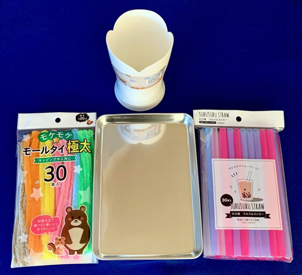 私は,そのUさんに「気持ちいい運動をして,元気が出てきたから,ちょっとだけ,簡単なお勉強をしましょう」と提案して,極太モール(商品名:モケモケ☆モールタイ極太)と大口径ストロー(商品名:大口径・スルスルストロー),長方形トレイ,ハンディモップ用のスタンドの4点セット(いずれも100円ショップのCan Do 商品)を提示しました(写真6)。