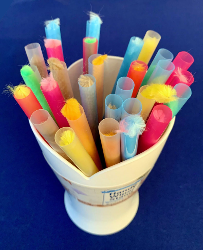 それから私は,「このモコモコしたぶっといモールを1本,これまたぶっといストロー1本に,シュルシュルって,差し込んで行きます!」と説明して,お手本を見せました(写真8,9,10)。