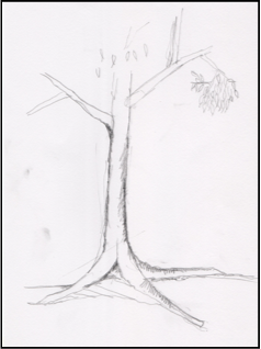 従来,筆者はカンボジア青年を対象にバウムテストを施行してきた(坂中,2014)。カンボジア青年のバウム画をコッホの58指標(コッホ,1957/2010)に分類してみたところ,No6 二線幹99%,No9 二線枝57%,No29 二線根51%,No36 カール状の樹冠29%と日本人のバウムとさほど大きな違いは見られなかった。しかしながら,外傷性指標でもあるNo26 落下中の,落下した実,葉,枝10%,No44 切断された枝,折れた枝(図2),幹14%,No45 幹や瘤や凹み14%とその出現率は高く,何がしかの傷つきを抱えていることが類推された。