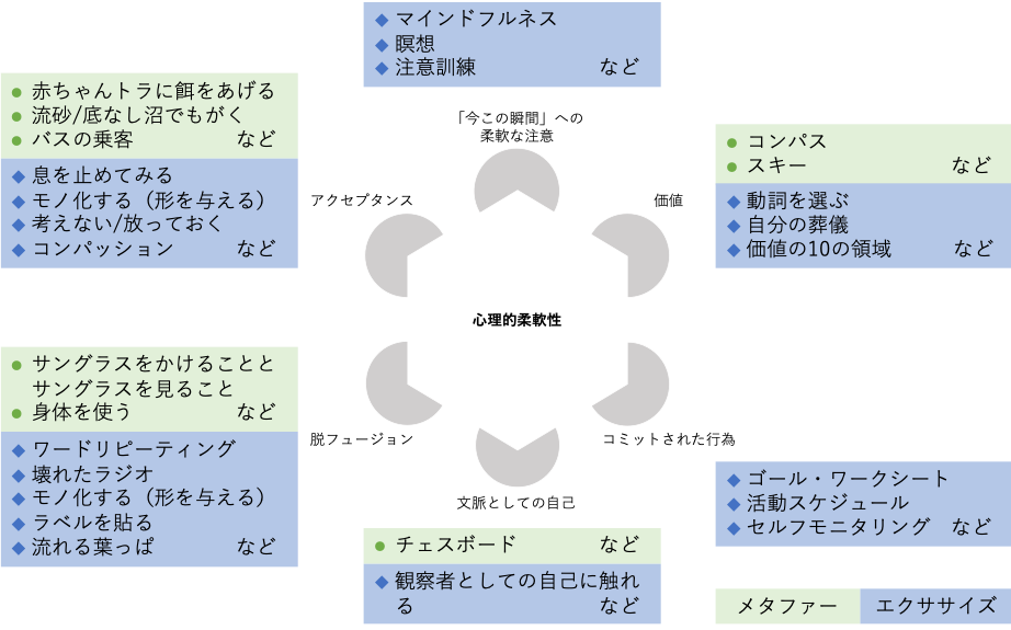 図4にあるように,ACTにはさまざまなエクササイズやメタファーがある。そしてACTでは,クライエントの特徴や文化に合わせて,セラピストが新たにエクササイズやメタファーを作り出すことも推奨されている(その場合は,心理的柔軟性モデルへの深い理解とともに,基盤となる関係フレーム理論などを理解しておくと安心である)。そのため,エクササイズとメタファーは無限にあるといっても過言ではない。ただし,エクササイズやメタファーを考えなしに使いまくるのは,ACTではない(というか心理的支援ではない!)。必ず,クライエントの状態像を理解して,変化のために必要な気づきやスキルを想定して,エクササイズやメタファーを導入する。CFに基づかない介入は御法度である。